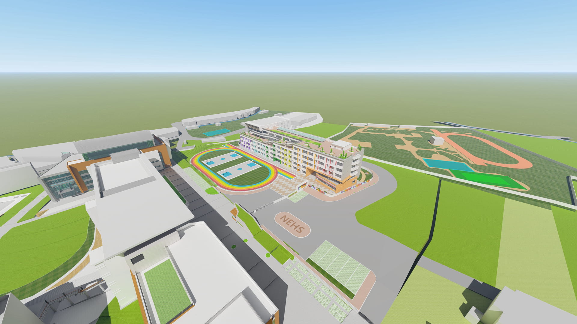 建築設計以幾何形式堆疊,透過不同樓層間的功能分區,適切地將所有機能需求配置於5層樓的建築量體,以水平與垂直動線串連。幼稚園配置於地面層西側,以辦公室與專科教室為中介空間連結國小部,而國小與雙語部教室以及專科教室則垂直疊砌分佈於上方樓層。另外,活動中心設置於四樓,其戶外大平台可作為活動時延伸的場域;加上,量體錯落疊砌所創造的平台與階梯,為有限的校地創造出許多空中的戶外空間。